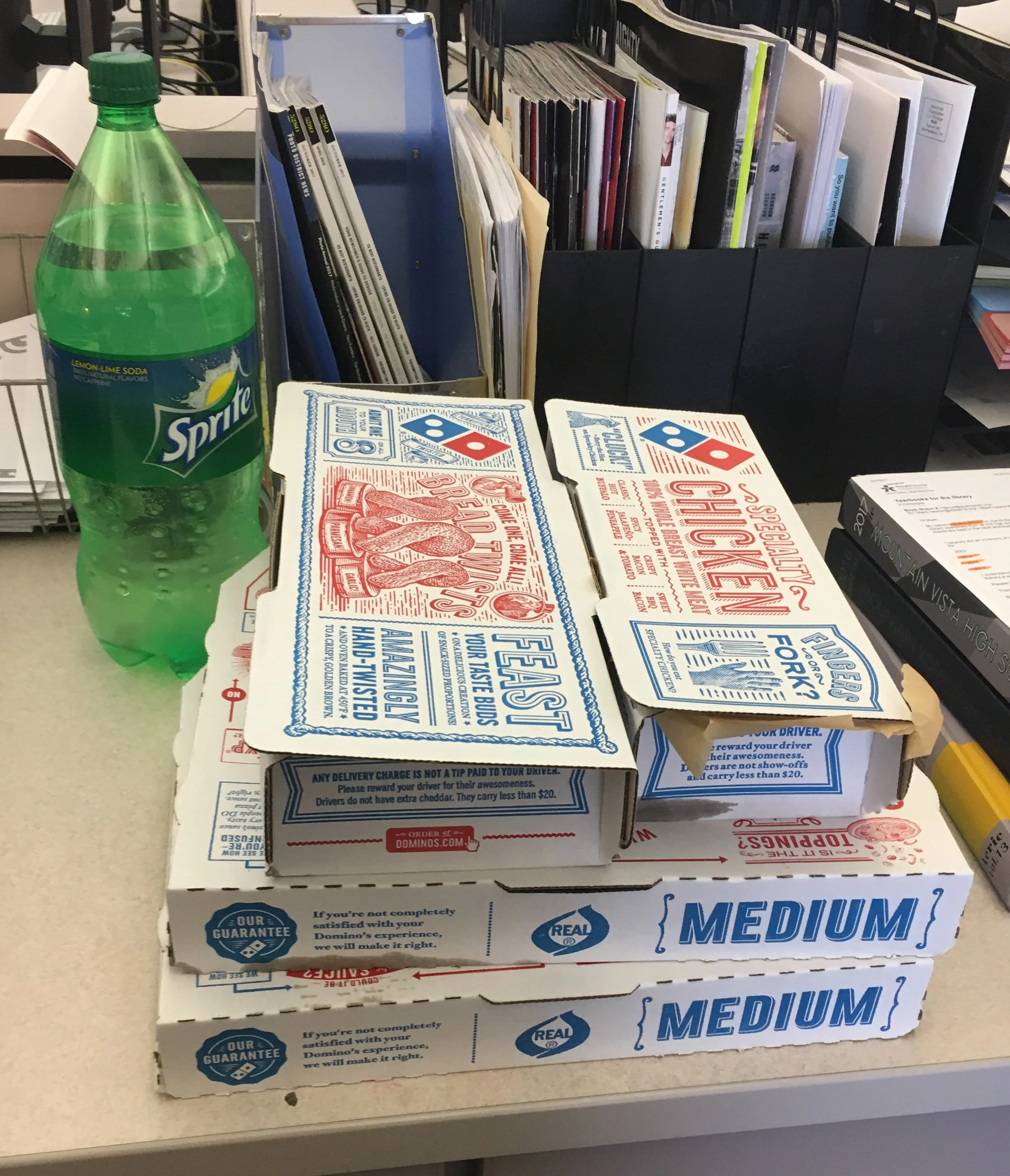 At work nights, we typically order pizza, gaining interest from staff members while also rewarding everyone for hard work.