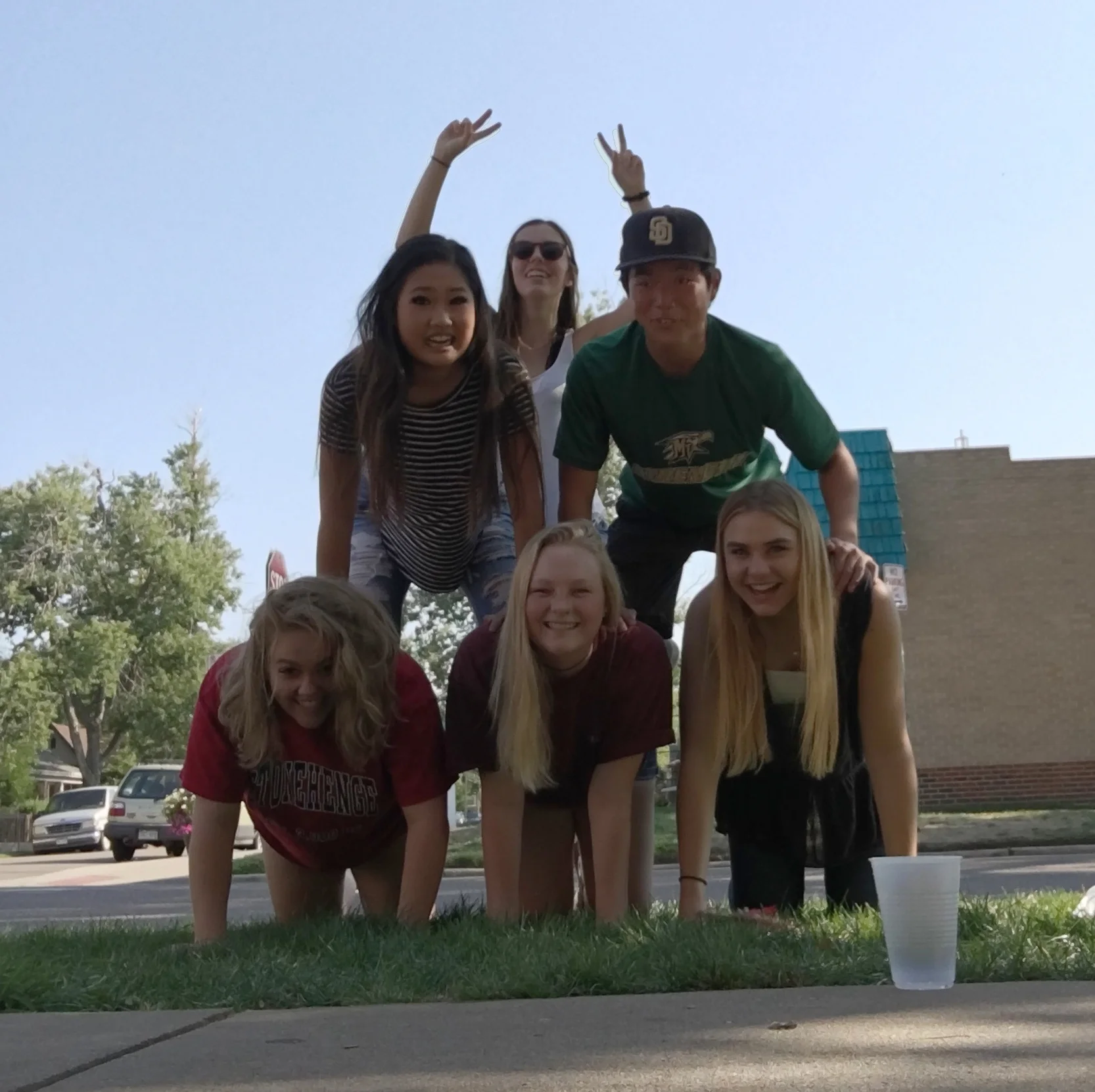 At our annual BBQ, we participated in a human pyramid as one of the scavenger hunt events.